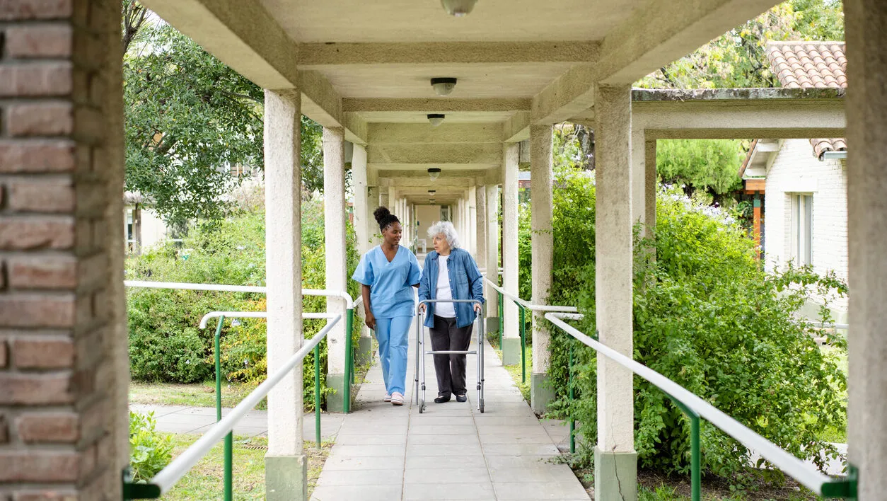 Female nurse helps a senior woman use a mobility walker outdoors at a nursing home. Supportive care provided in a rehabilitation center.