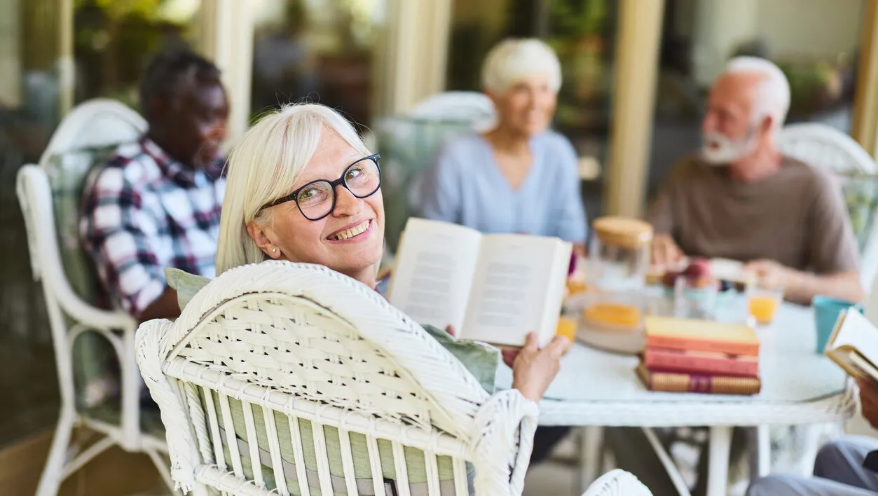 Happy mature woman reading a book while enjoying with her friends during social gathering on a balcony of a nursing home and looking at camera.