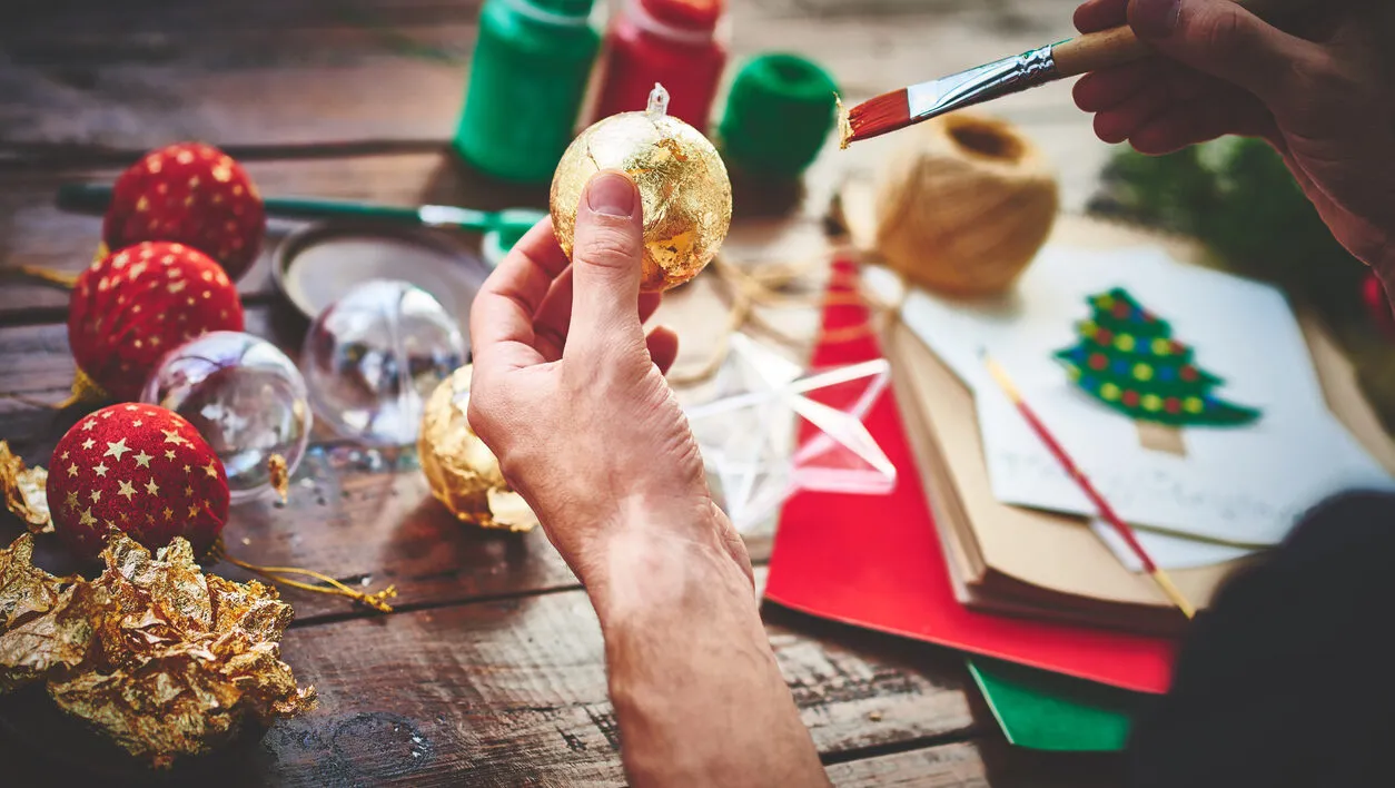 photo of human hands decorating Christmas balls
