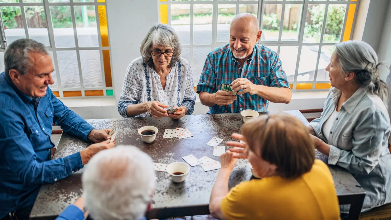 Group of seniors, men and women playing cards together at a retirement home