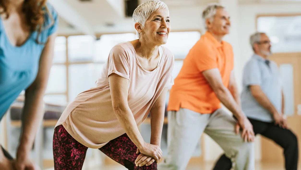 Happy senior woman working out with group of friends on exercise class in a health club.