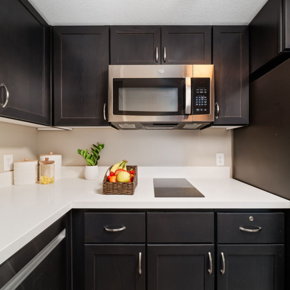 - Functional kitchenette with quartz counter tops, microwave, and refrigerator
