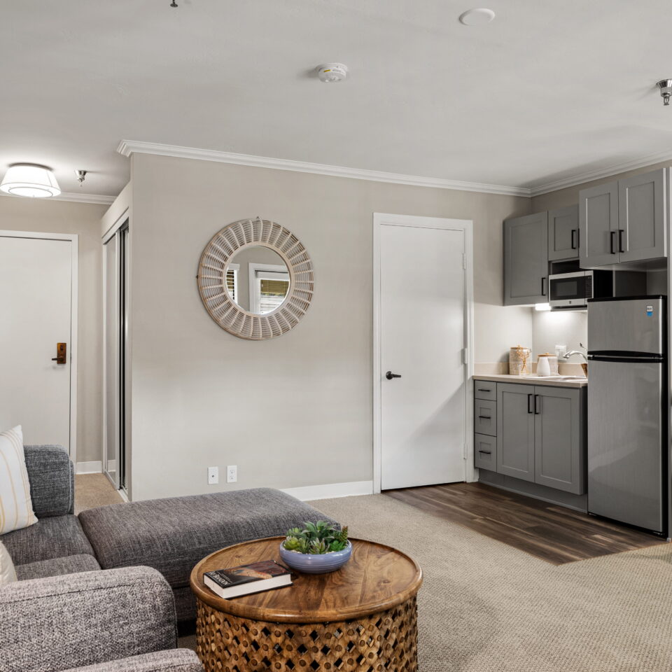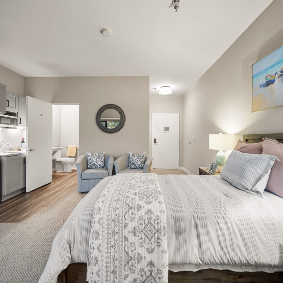 Our apartment homes are bright, spacious, and comfortable. With upgraded features and large windows, you will feel right at home in your private studio or one-bedroom suite. Our one-bedroom suites offer one or two bathrooms.